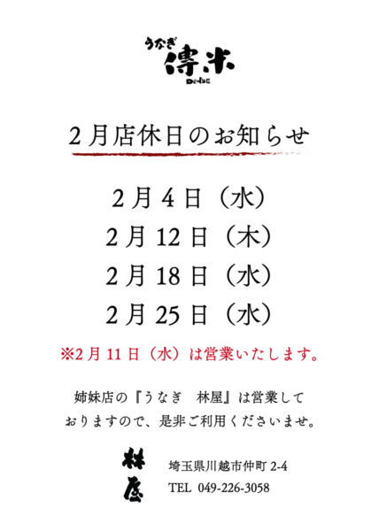 【うなぎ傳米】【2月営業のお知らせ】