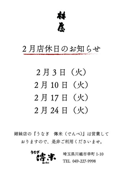【うなぎ林屋】【2月営業のお知らせ】