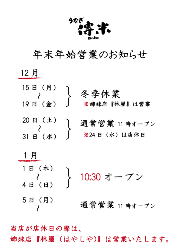 【うなぎ傳米】【年末年始営業のお知らせ】