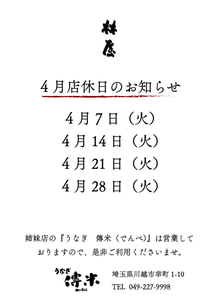 【うなぎ林屋】【4月営業のお知らせ】